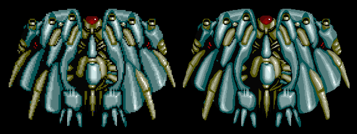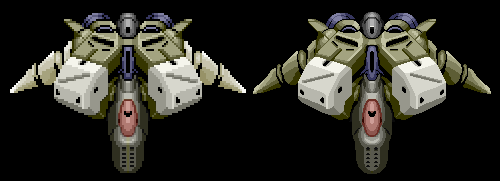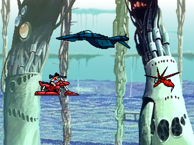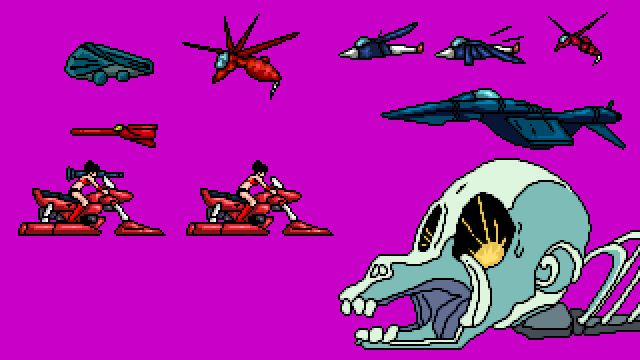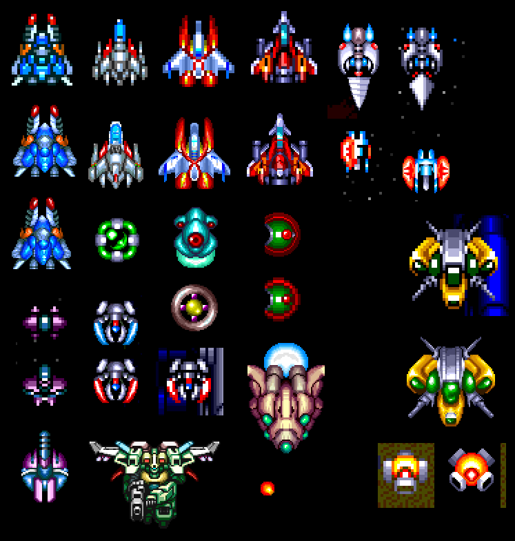 This was going to be an homage to the series of vertical shoot 'em ups by Hudson Soft on the PC Engine. I took various graphics from these games (Gunhed, Super Star Soldier, Soldier Blade & Final Soldier) and cleaned them up for a higher resolution. Nothing more than these images below was completed. The robot with wings was just recoloured from a large sprite, not redrawn. |