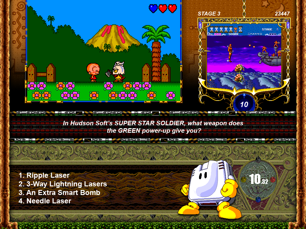 Taking influence from the Japanese style multiple choice quiz games, Quiz PC Engine was a spiritual successor to my Amiga title 'Quiz Arcade'. It was to feature questions based around the games of the PC Engine (Turbografx-16) console. The concept for the main play area would be for the player to be represented by the PC Genjin (Bonk) character on a map, defeating enemies when questions are answered correctly. Many questions were written, and screenshots were grabbed which would appear on the right hand side of the display. The main play area is constructed of graphics from various games. Programming was never started (or if it was, I never saw any results of it). Below is a mock-up of the play area.