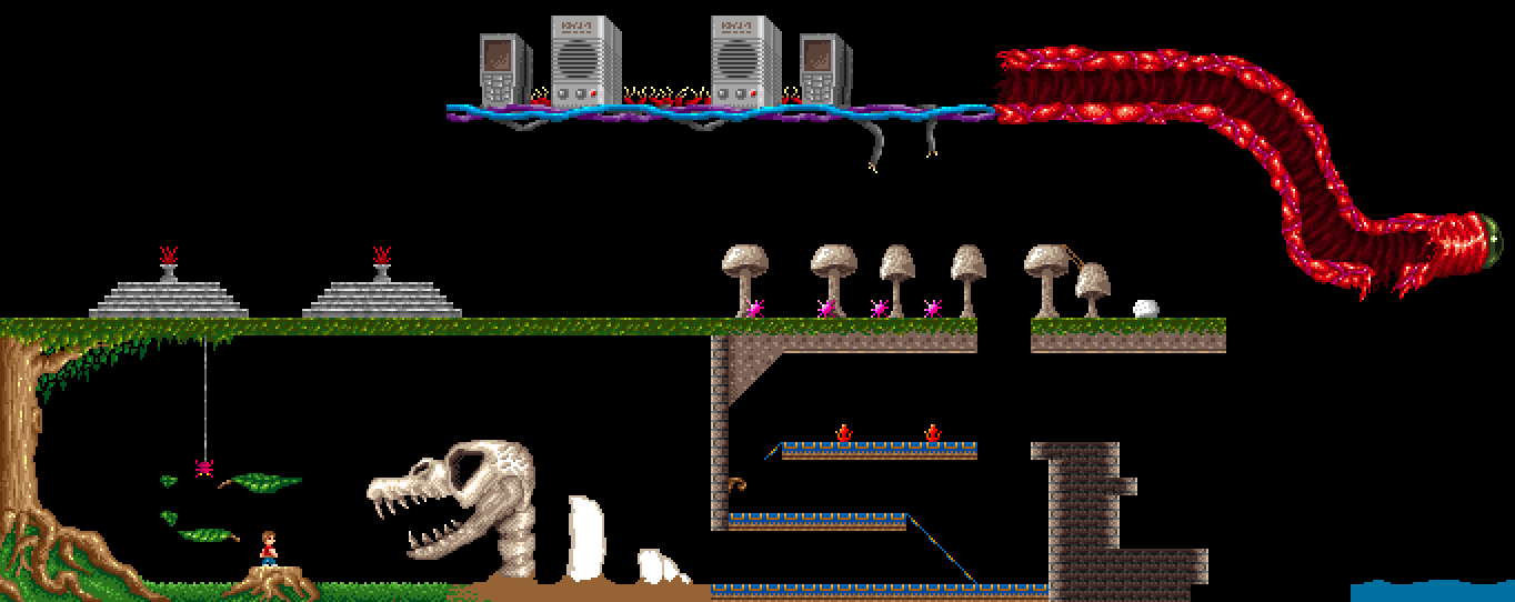 The concept of this game was to take traditional Jet Set Willy style gameplay (precise platform jumping and dodging) and instead of many scrolling or flip-screens, have the whole area map on a single screen with tiny sprites. The plan was to have the game designed so people could easily create new maps - they would have a .bmp image made from simple colours (representing collision boxes, slopes, danger areas) and then a .bmp with the actual visuals. With some simplistic coding to set moving platforms, number of lives etc. it would have become a great way to make unique and interesting platform game levels. As usual, programming never got past some very basic initial tests. Years later, it seems something similar has been released on the Xbox (without the level creation tools). Most good ideas I have end up being made by someone else, years after I have them.