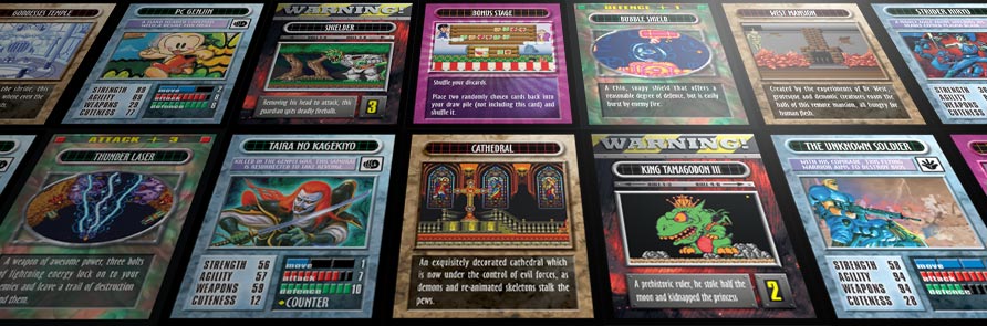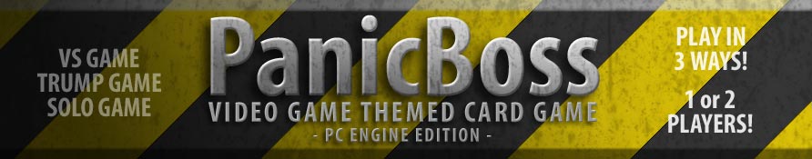 PanicBoss is a download-and-print card game designed around video game characters and locations. Although themed around games on the NEC PC Engine / TurboGrafx-16, many games featured will be familiar to the classic gamer. The game can be played with the full 2 player ruleset, or as a simple trump game or solo experience if you wish.